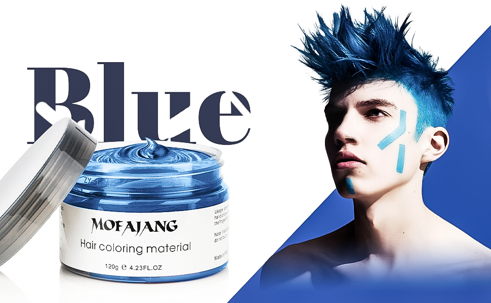 The Blue Hair Color Wax Pomade is a 4.23 oz temporary hair dye made from natural plant extracts, designed for easy application and removal. Ideal for various occasions, it allows you to express your creativity without damaging your hair.