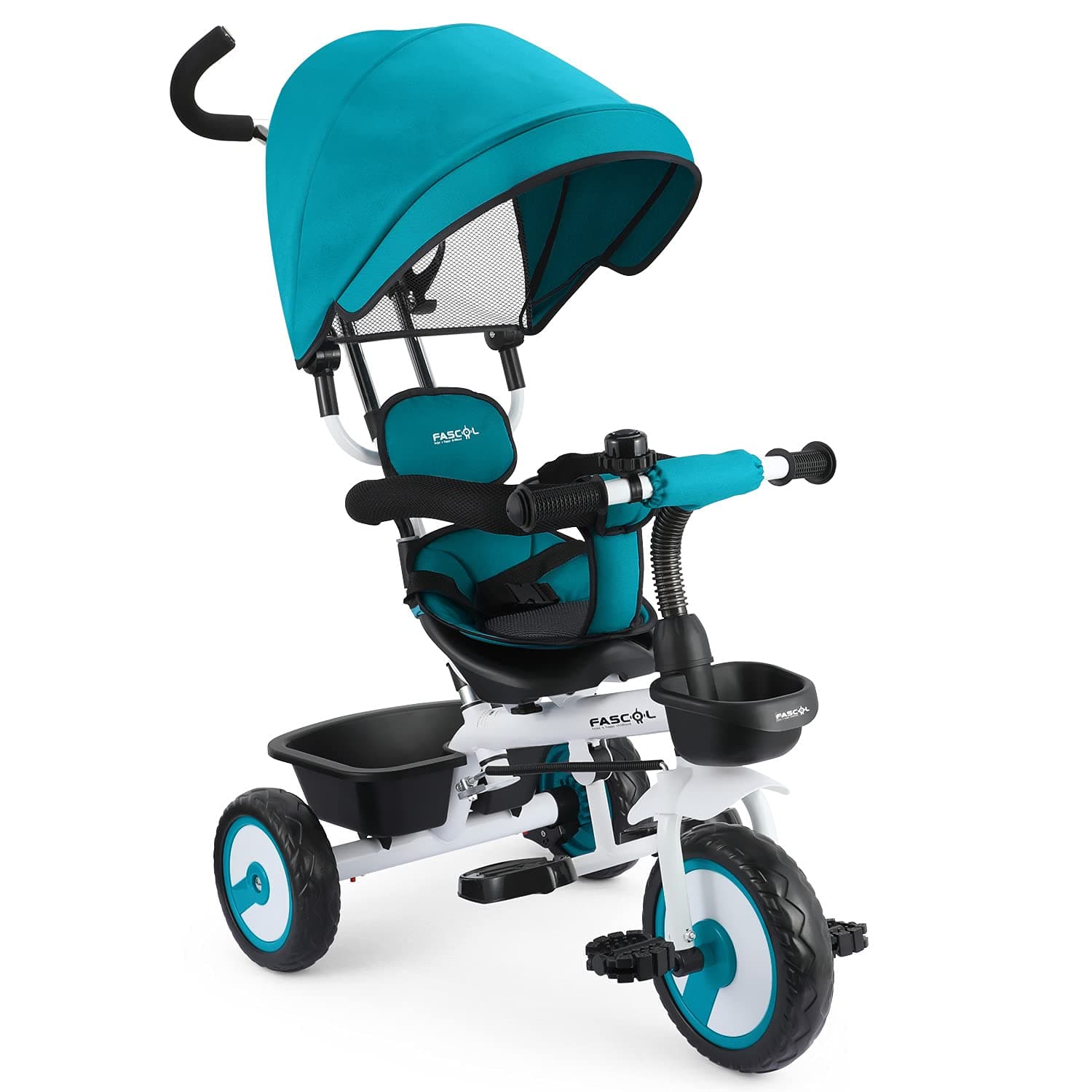 The Fascol Baby Trike 4-in-1 is a robust, CE & ASTM certified tricycle designed for children aged 12 months to 5 years. Featuring a height-adjustable parent push handle with steering linkage, eco-friendly EVA wheels, and a sturdy aluminum alloy frame, it ensures durability and smooth rides on varied terrains. Comfort and safety are prioritized with a retractable canopy, 2-point safety belts, safety fence, and foldable footrest. Additional conveniences include a front basket, rear storage bin, bell, and foot brake, making it the perfect outdoor companion for growing kids and their parents.