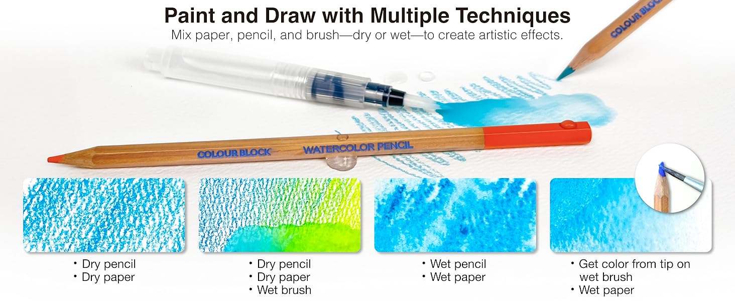 The COLOUR BLOCK Watercolor Pencil Travel Art Set is a 34-piece professional drawing kit featuring 24 highly pigmented watercolor pencils, 2 sketching pencils, 50 sheets of 6x8 inch acid-free watercolor paper, a vinyl eraser, a metal sharpener, a water brush, and 3 synthetic brushes—all housed in a durable zippered canvas case. Designed for versatile wet or dry use, this portable set is perfect for artists of all skill levels seeking vibrant, blendable colors on the go.