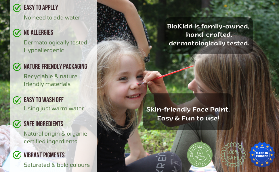 BioKidd’s Natural Face and Body Paint Kit features three organic-certified cream colors (green, brown, black) designed for sensitive skin. This hypoallergenic, quick-drying formula is easy to apply and remove, making it ideal for kids and adults alike. Made in the EU with premium raw materials, it’s perfect for events from sports games to Halloween, delivering safe, vibrant camouflage with zero hassle.