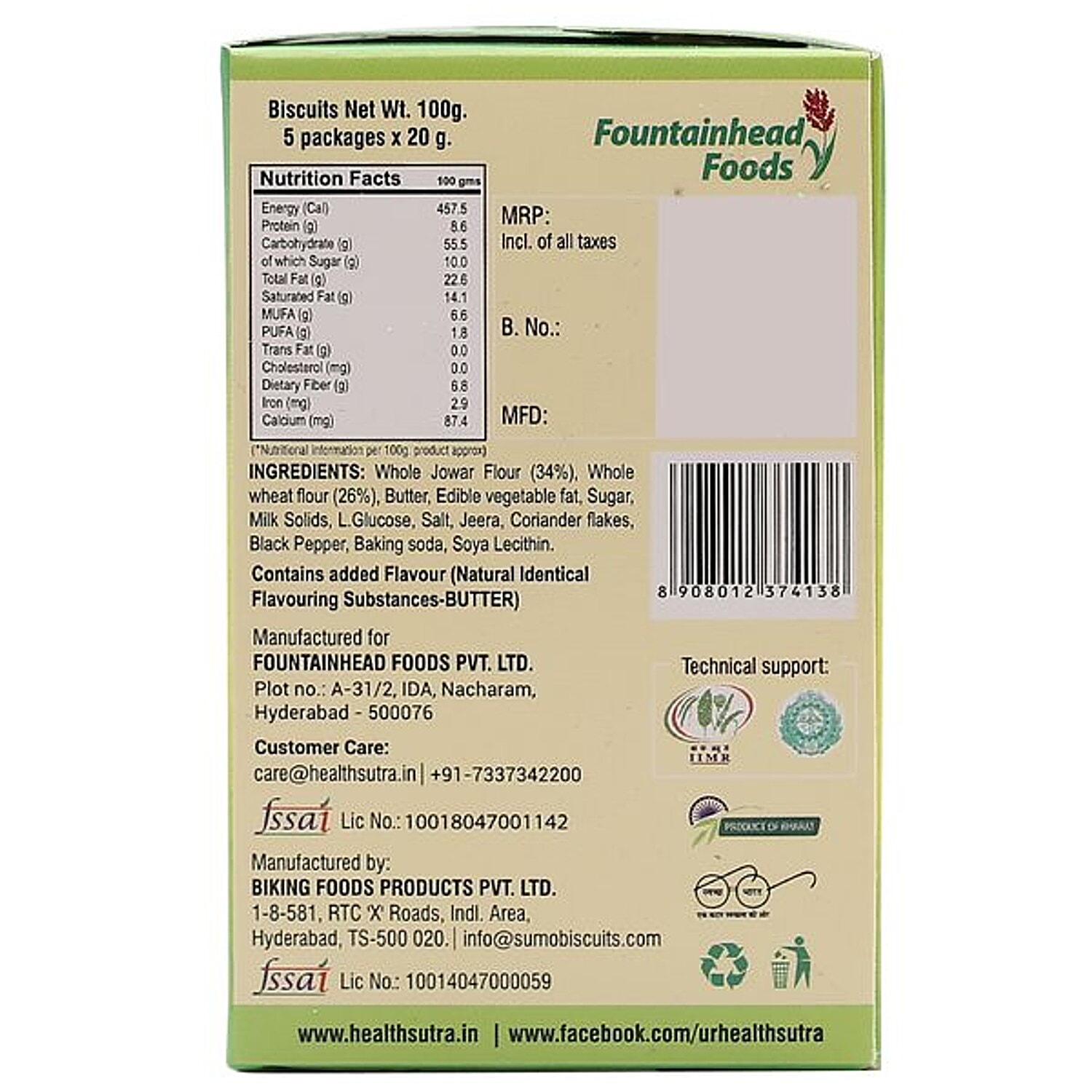 About @import url("https://www.desercart.com/static/froala_style_v2.min.css"); These are high fiber salted digestive biscuits are made from 100% whole grain jowar. Jowar is a rich source of antioxidants and offers overall well-being. Complex carbohydrates in jowar keep you full for longer and also help you fight lifestyle diseases like diabetes. These biscuits are a healthy option for you to satisfy your hunger with taste. Ingredients @import url("https://www.desercart.com/static/froala_style_v2.min.css"); Whole Jower Flour (34%), Whole Wheat Flour (26%), Butter, Edible Vegetable Fat, Sugar , Milk Solids, Liquid Glucose, Salt, Ajwain , Coriander Flakes, Pepper , Raising Agents- Ins 500(i), Ins 503(i), Baking Powder , Binding Agent (Ins E322), Contains Added Flavour (Natural Identical Flavouring Substances - Butter.