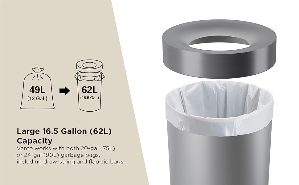 In my lifetime, I've purchased & tried MANY MANY trash cans...I was VERY HAPPY to stumble upon this little gem when I was walking through the Container Store one afternoon.There was a bronze-colored one + a silver one on display.They were SO much more attractive to look at than every one of the expensive, fancy automatic cans around them!I loved it the minute I saw it!It has the look of a bullet trash can (which I love & had been looking for); the color & design make the can look much more expensive & attractive than other cans.MOST IMPORTANTLY, this trash is larger & holds MUCH MORE trash than the usual 13gal cans I've always owned!And, although its larger in size, it still looks good in my kitchen! Perfectly sized, not too big; not too small!I stalked Amazon until it went on sale & purchased TWO of the bronze colored cans--one for trash, the other for recyclables.I have them sitting side by side in my kitchen & they look great w/ my kitchen decor!!These cans hold aloooot more than any other can Ive owned!It works perfectly as either a trash can or for recyclables!!The swing top is great, easy to toss trash into it. It's a piece of cake to empty when its full: just lift off the top & pull out the bag!This can also has a rim cover under the swing lid that holds trash bags in place (which I love).As for the trash bags...I tried the 13 gal ones (w/ drawstring) I had at first; which I was able to stretch & fit, but would fall down into the can as soon as the bag got near full. I tried the tie top 13 gal bags, which also fit; but since they don't reach to the bottom of the can, would fall in when the bag was full.So...I found larger bags (on Amazon &/or Walmart.The 18-20 gal bags fit fantastically, so I prefer to buy them for this can. They're not much more $ than 13 gal ones & they really do hold ALOT MORE trash &/or recyclables!!This can is not noisy like the automatic cans & step lid cans Ive owned; the top swings open & you put in your trash.It's only noisy if your kids use it like a drum as mine did when I first bought it...This can is made of heavy duty (plastic-like?) material; both the lid, rim & can are sturdy (enough to withstand the multiple times I've dropped it & the abuse of my 2 little ones messing with it).The assembly is this:*Open shipping box*Put can on the floor*Put bag in can*Put rim cover on*Put lid on topQuite simple...Anehewww- this can is GOOD STUFF!!!I HIGHLY HIGHLY RECOMMEND BUYING THIS!!!And if you (hopefully) recyxle, buy a second one for that!!Thank you once again Umbra!!
