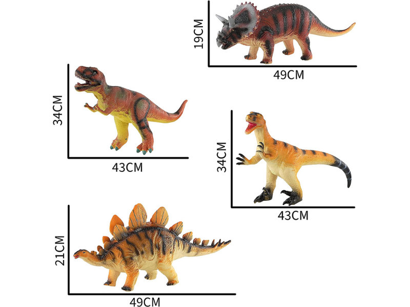 This set of 4 large soft foam dinosaur figures, measuring 36cm, is designed in vibrant museum colors, perfect for young dinosaur enthusiasts. With a soft, realistic feel and intricate detailing, these toys are ideal for imaginative play in kids' bedrooms. Suitable for ages 3 and up, they require no assembly and are made from safe, non-toxic rubber.