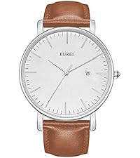 The BUREI Men's Minimalist Dress Watch combines a slim, vintage-inspired design with durable mineral crystal and a precise quartz movement. Featuring a comfortable brown leather strap and 3ATM water resistance, it’s built for everyday wear and versatile enough for business or casual settings.