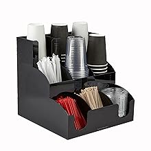 The Mind Reader 9 Compartment 3 Layer Organizer is a sleek, black acrylic condiment caddy measuring 12.2" x 12.2" x 12.7" and weighing just 1.96 kg. Designed for professional and home environments, it features 9 compartments across three tiers to neatly store coffee cups, lids, sugar packets, creamers, and more—making every coffee break effortlessly stylish and organized.