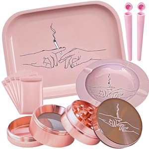 The Rolling Tray Bundle Kit by UkGlass features a large, vibrant pink metal rolling tray paired with a 4-piece tobacco grinder with catcher and scoop, a matching ashtray, and 5 assorted storage bags plus 2 tubes. Designed for tobacco use, this compact yet spacious set combines style, precision, and organization to enhance your smoking experience.