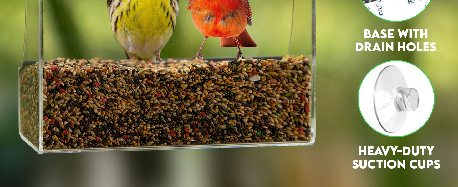 GB-6895 Clear Window Bird Feeder, Compact Wild Birdfeeder with Drain Holes, Super Strong Suction Cups, Transparent Viewing, Covered, High Seed Capacity, Rubber Perch