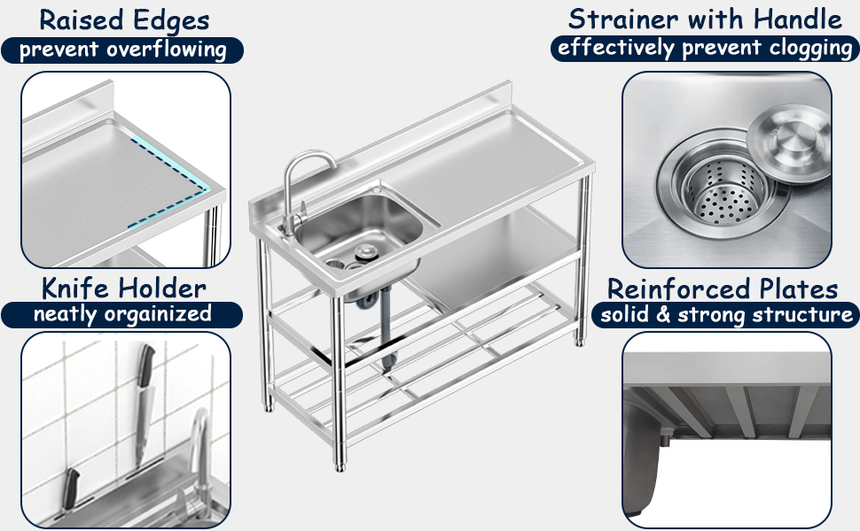 The KINGBO Free Standing Stainless-Steel Single Bowl Commercial Sink Set combines industrial-grade 304 stainless steel durability with a spacious 47-inch workspace, including a drainboard and double storage shelves. Featuring a 360° rotating gooseneck faucet and easy-to-clean rounded corners with detachable filters, this sink is engineered for professional kitchens and serious home chefs alike, delivering unmatched prep efficiency and hygiene.