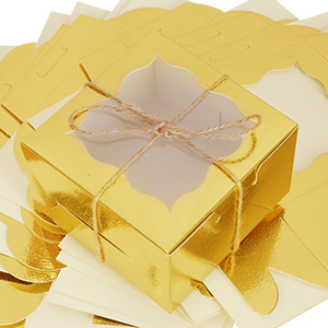 The KPOSIYA 20 Pcs Gold Bakery Boxes combine elegant gold kraft paper with a clear window to beautifully showcase your baked treats. Sized at 4x4x2.5 inches, these eco-friendly, sturdy boxes come with thank you tags and jute twine, perfect for gifting, selling, or special events. Pre-folded for easy assembly, they offer a stylish, sustainable solution to elevate your bakery presentation.