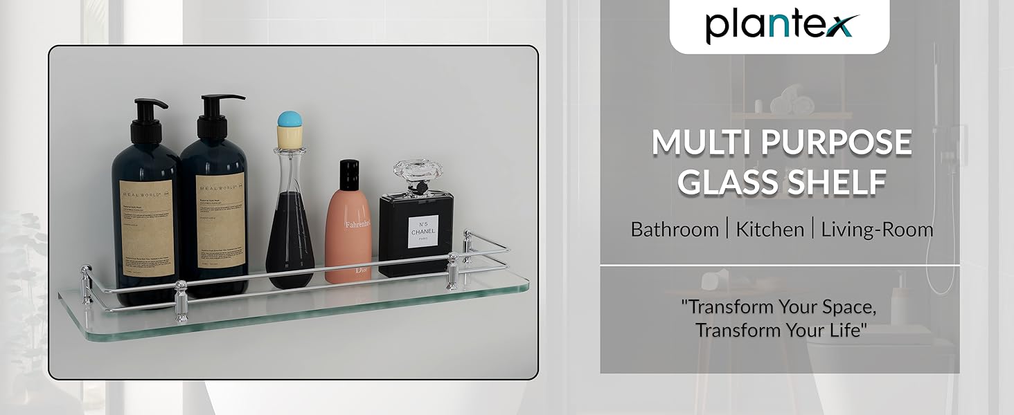 The Plantex Premium Transparent Glass Shelf is a durable, 8mm thick white transparent glass shelf with brass and stainless steel anti-rust fittings. Measuring 18x6 inches, it offers versatile wall-mounted storage for bathrooms, kitchens, and living rooms. Designed for easy installation with included hardware, it combines sleek modern aesthetics with practical multi-use functionality, perfect for millennial professionals seeking stylish organization solutions.