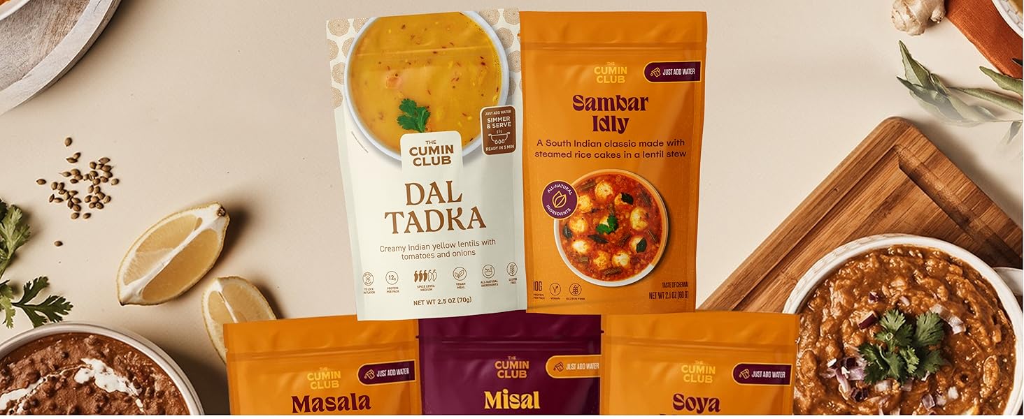 The Cumin Club offers a pack of 5 ready-to-eat vegan Indian entrees, including Dal Tadka, Sambar Idly, Masala Poha, Misal Pav, and Soya Masala. Each dish is crafted by regional chefs in India, using natural ingredients and innovative freeze-drying technology to ensure authentic flavors and nutrition, all ready in just 5 minutes.