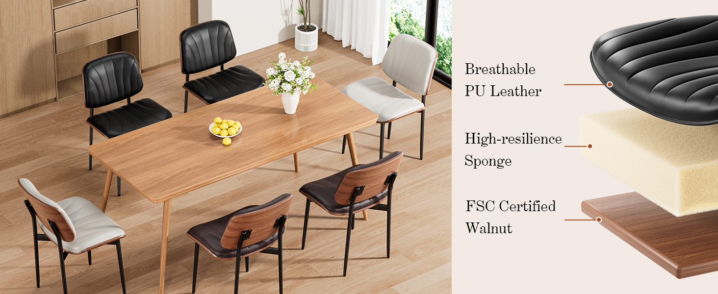 This set of 4 mid-century modern dining chairs combines ergonomic design with premium materials, featuring a walnut bentwood back, PU leather upholstery, and a sturdy metal base. With a maximum load capacity of 330 lbs and adjustable feet for stability, these chairs are perfect for any room in your home. Easy to assemble in just 10 minutes, they offer both style and functionality while being eco-friendly with FSC-certified wood.
