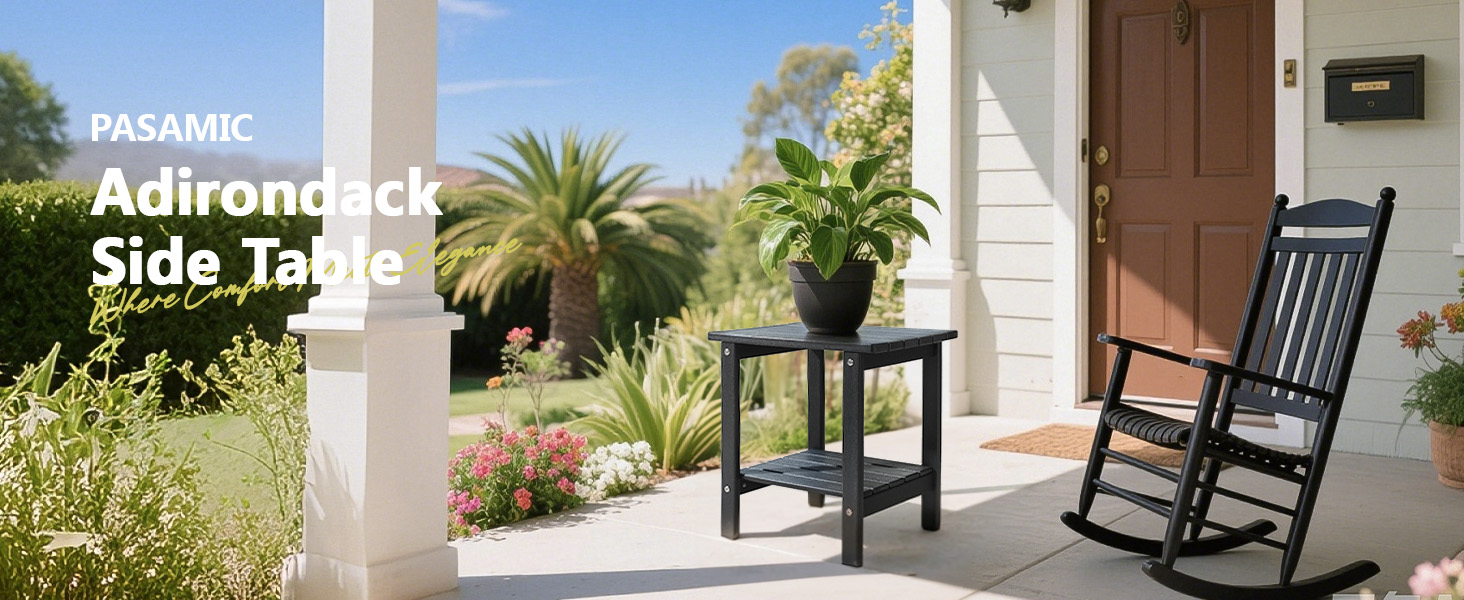 The PASAMIC 2-Tier Adirondack Square Side Table is a weather-resistant, easy-to-maintain HDPE outdoor table featuring two spacious tiers with a combined weight capacity of 320 lbs. Designed for both indoor and outdoor use, it boasts a sleek black finish, smooth edges, and quick assembly, making it the perfect companion for patios, gardens, and pool areas.