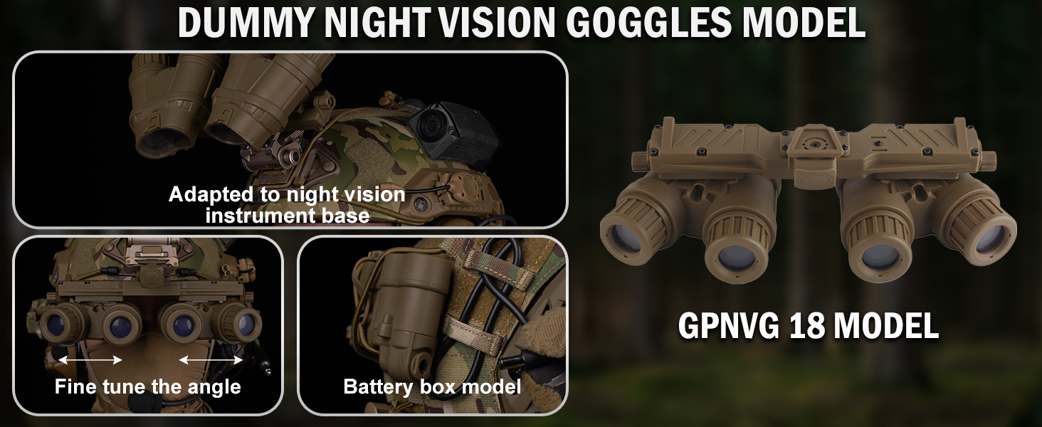 The Zhongren Dummy Night Vision Goggles Model is a lightweight, non-functional replica of the AN/PVS31 GPNVG 18 tactical goggles. Designed for cosplay, airsoft, paintball, and movie props, it mounts easily on tactical helmets and delivers authentic military aesthetics without the complexity or cost of real night vision tech.