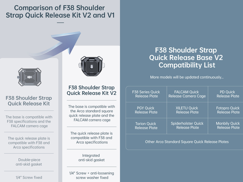 The FALCAM F38 Camera Clip V2 is a precision-engineered quick release system compatible with all Arca standard plates. Crafted from high-strength aluminum alloy, it supports up to 20kg while featuring a redesigned self-locking pin and dual anti-skid plate for unmatched stability. Its optimized ear hole design ensures seamless integration with shoulder straps, making it the perfect lightweight, durable companion for professional photographers on the move.