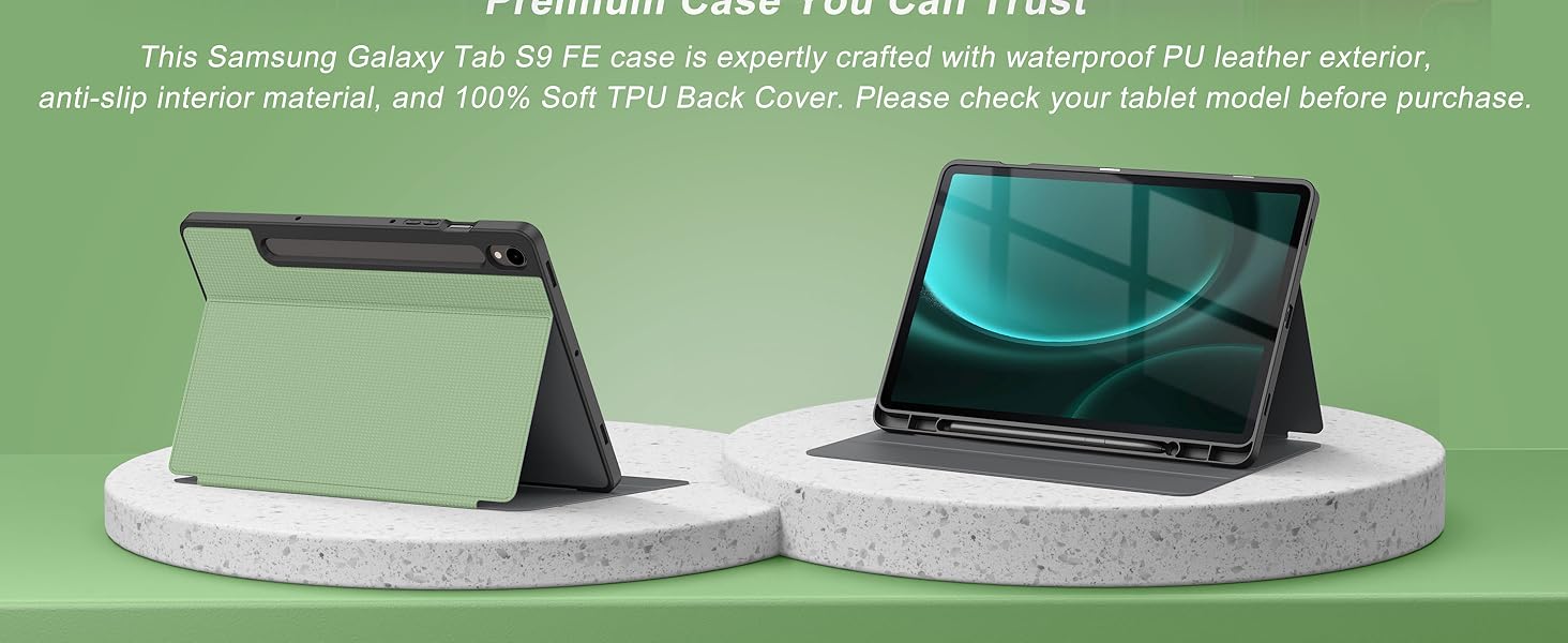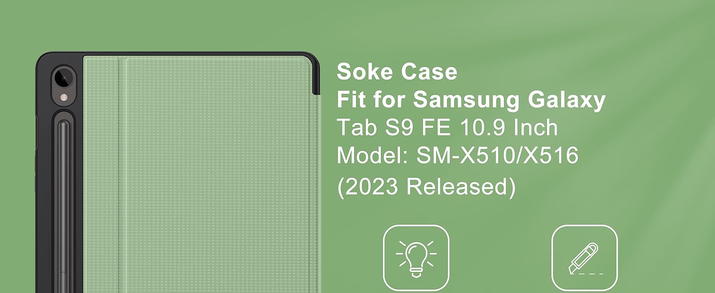 The Soke Case for Samsung Galaxy Tab S9 FE 5G 2023 offers a shockproof soft TPU back cover with magnetic closure, dual adjustable stand positions for optimal viewing, and precise cutouts for full device accessibility. Designed exclusively for the 10.9-inch Galaxy Tab S9 FE, it combines rugged protection with sleek folio functionality, backed by a 12-month support guarantee.
