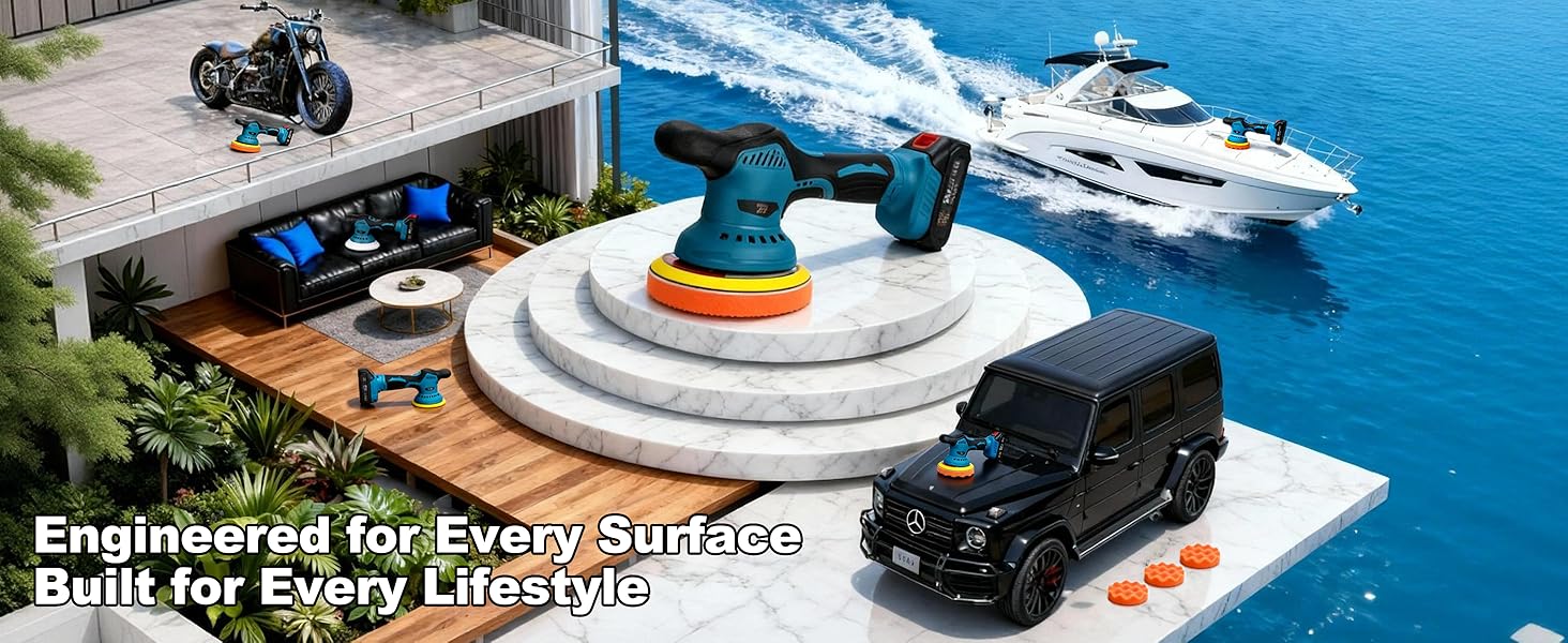 The Boka Bay Cordless Car Buffer Polisher Kit features dual 21V 2000mAh lithium-ion batteries for continuous cordless use, an 8-speed orbital polisher delivering 2800-6000 RPM for customizable polishing power, and a comprehensive 9-piece accessory kit. Designed for versatile use on vehicles and various surfaces, it offers professional-grade, swirl-free finishes with the convenience of cordless freedom.