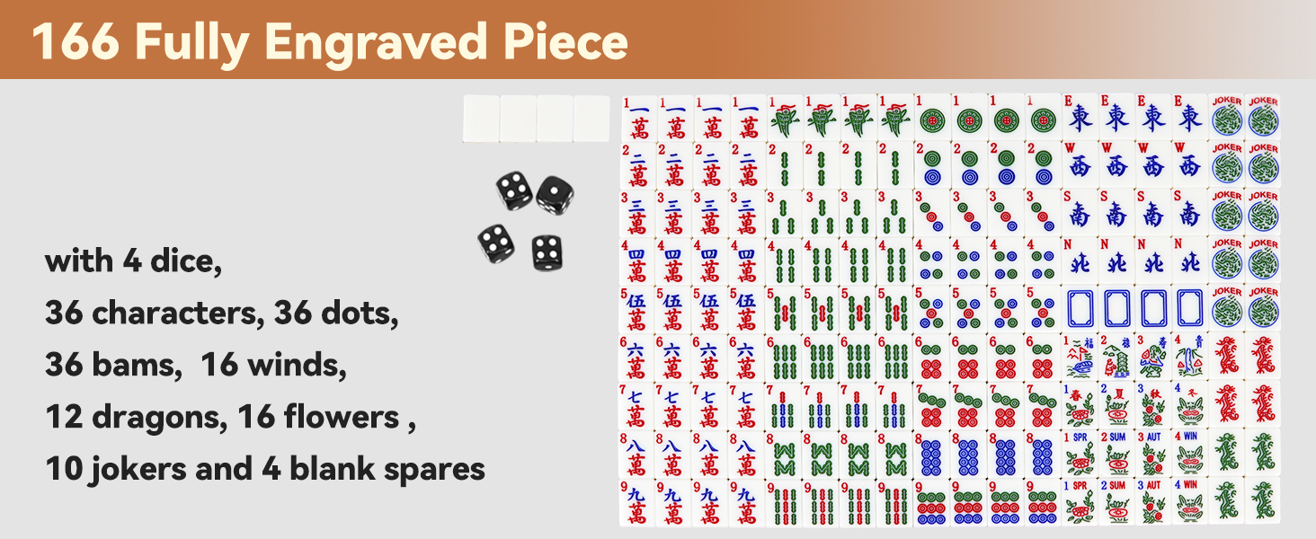 - COMPLETE AMERICAN SET - 166 fully engraved tiles plus 4 dice—everything you need for authentic 2025 Western Mahjong.