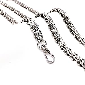 This is a NICE heavy weight wide chain. Looks great with the Coach Nolaita handbags to switch out the length too! Highly recommend.